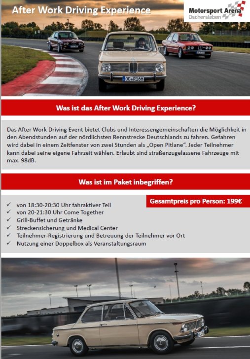 Die Motorsport Arena veranstaltet am 10. Mai das erstes After Work Driving der Saison. Derzeit stehen noch ein paar Plätze zur Verfügung.
