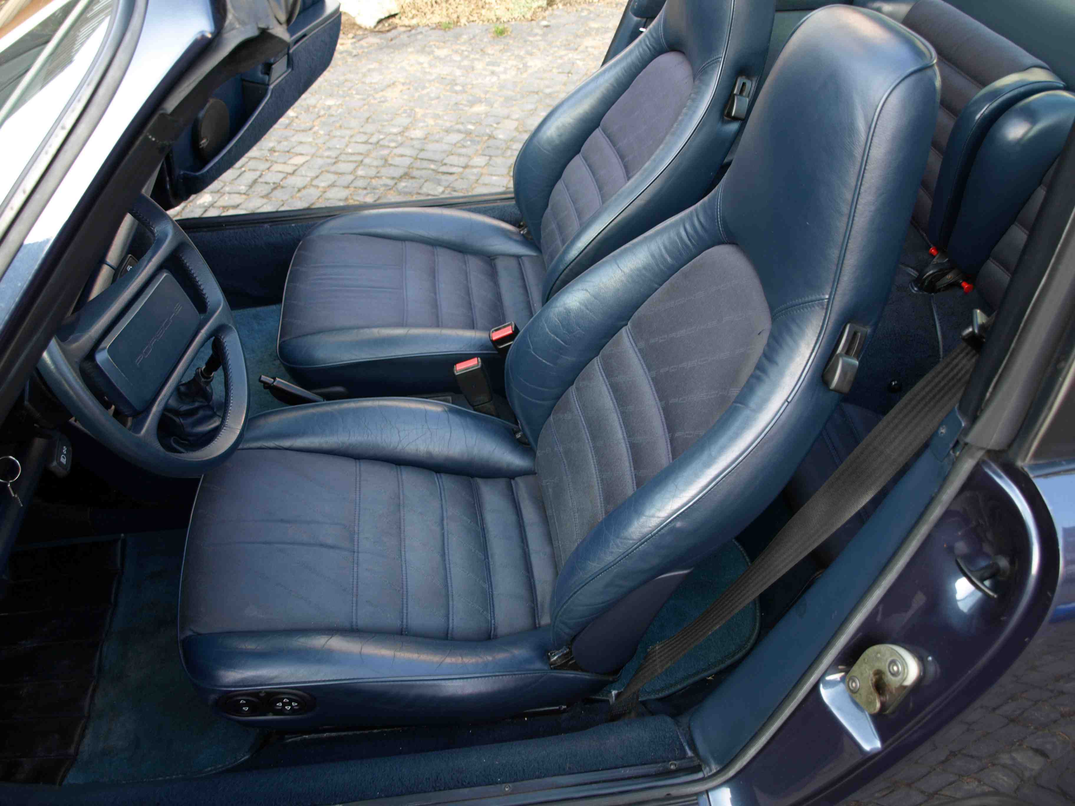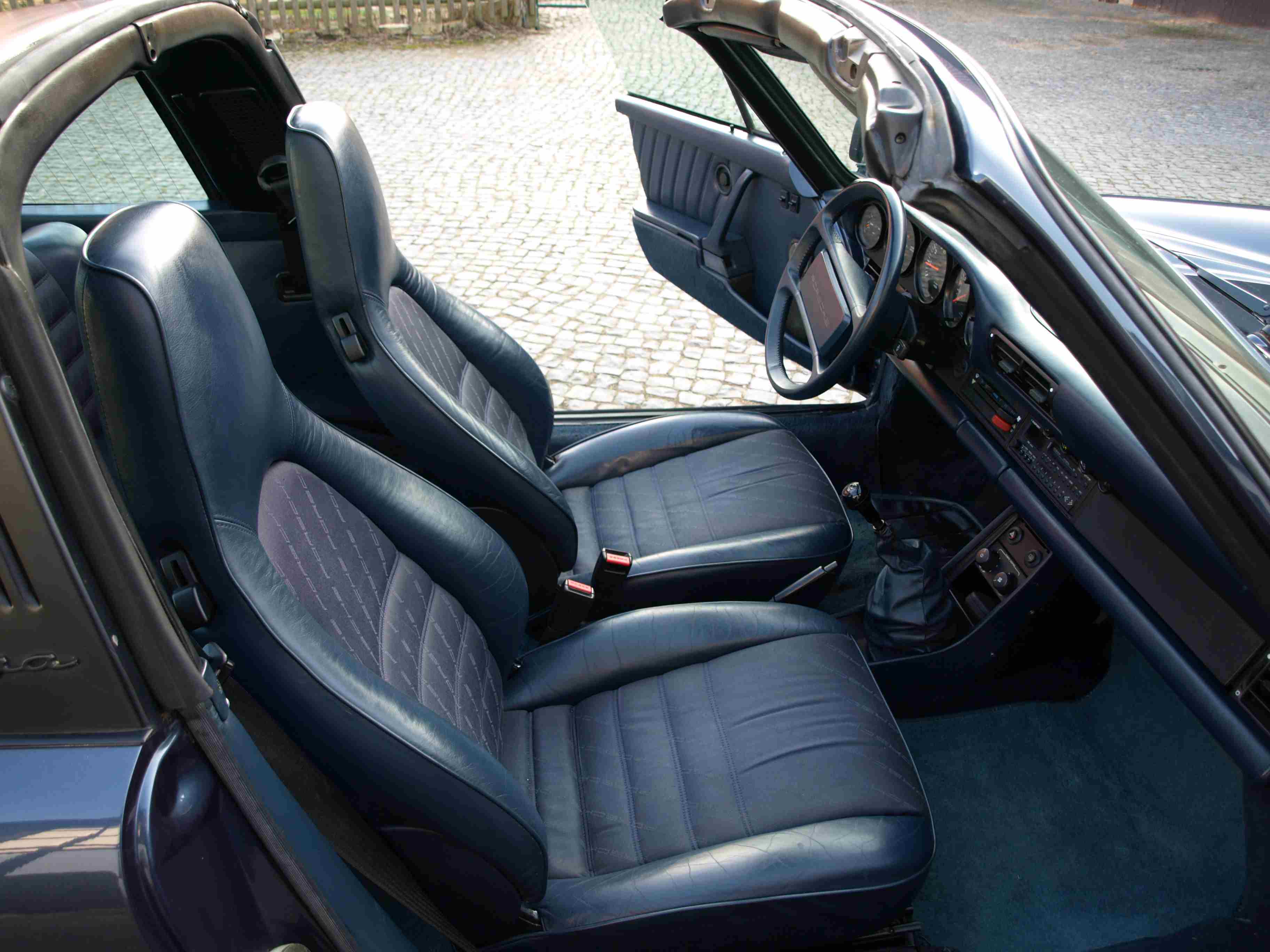 Volleder-Ausstattung blau (Sitze, Lenkrad, Armaturenbrett, Türblätter, Mittelkonsole usw.), Sitzmitte Stoff mit Porscheschriftzügen.