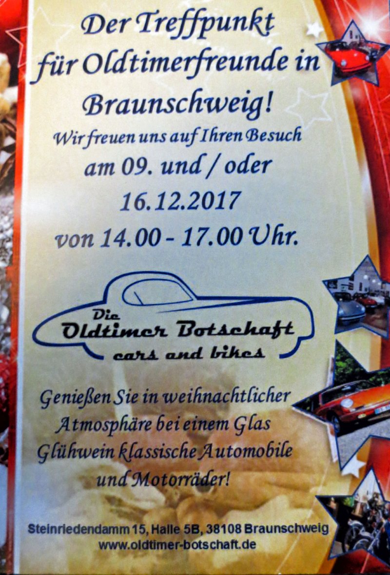 unser letzter Stammtisch im Jahr 2017 findet am Samstag den 09. Dezember in der Oldtimer Botschaft in Braunschweig statt. Aktuell liegt uns dazu die Einladung von Harry Schomburg vor.