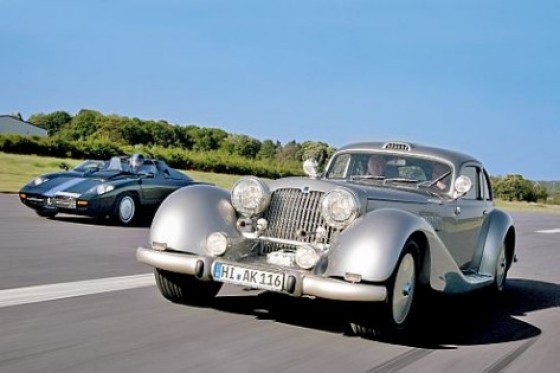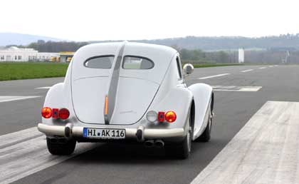 Statt im aerodynamischen Sportwagenkleid kommt der Isdera mit dem historisch klingenden Namen Autobahnkurier im pompösen Dress der 30er Jahre daher. Stromlinienflosse gegen Seitenwind, weit ausladende Kotflügel, eine verbreiterte Fahrgastzelle vom VW Käfer und außen liegende Flexrohre für das Abgas geben ihm eine einzigartige Form. Erfunden hat sie Autodesigner Eberhardt Schulz. Das moderne Denkmal ist sein in Metall gegossener Lebenstraum. Ein Klassiker, straßentauglich und mit einer Höchstgeschwindigkeit von 250 km/h.