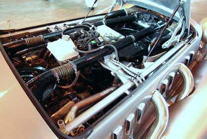 Alles an der Karosserie ist von Hand gedengelt. Mehr als 20.000 Arbeitsstunden stecken im Projekt Autobahnkurier. Auch das Licht ist selbst gebaut: Die Außenhülle stammt von einem Montage-Scheinwerfer, innen verbirgt sich solide Polo-Technik. Die drei kleinen Scheibenwischer sind ebenso typisch für die damalige Zeit wie die großen Trompetenhörner. Der Isdera Autobahnkurier 116i fährt mit Allrad. Unter dem Blechkleid arbeiten gleich zwei parallel gekoppelte V8-Mercedes-Motoren mit insgesamt zehn Litern Hubraum. Und so wird das Ungetüm in Bewegung gesetzt: Der linke rote Knopf startet den vorderen V8, der rechte Knopf am Marmorcockpit startet die hintere Maschine.