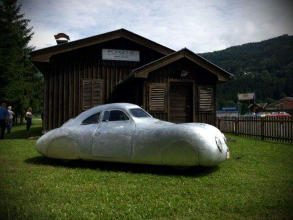 Die historischen Gebäude von Porsche Gmünd. Dieses Fahrzeug Typ 64 (Nr. 3) ist der erste echte mit Namen Porsche! kaufte 1949 der Österreicher Otto Mathé, der es bis 1951 im Motorsport einsetzte.