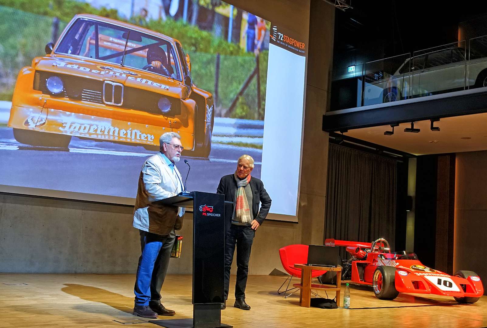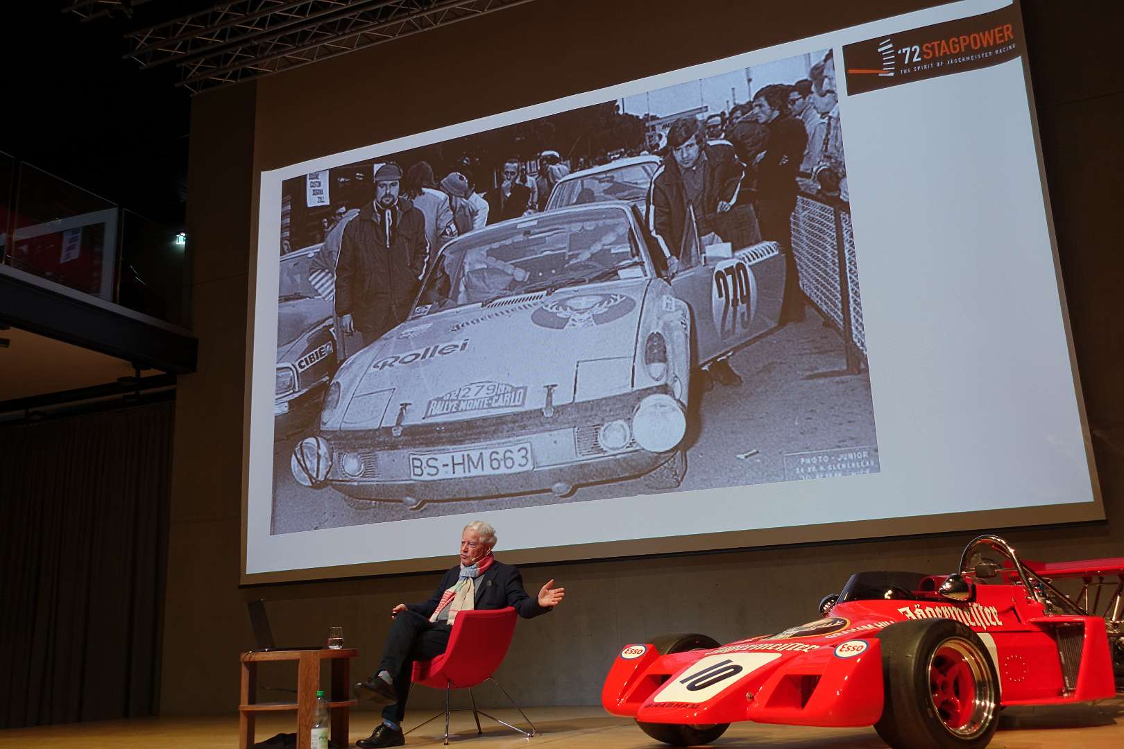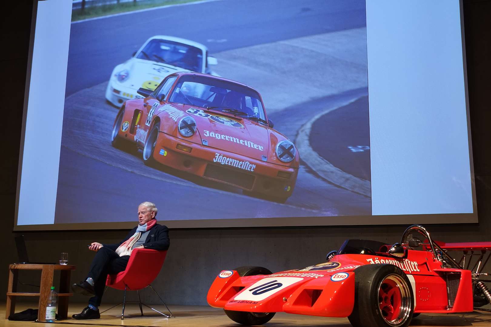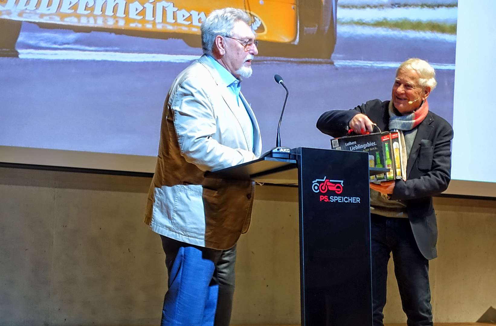 Eckhard Schimpf erzählte, so wie wir es von ihm kennen, vom damaligen Rennsport-Zirkus, wie es damals mit ihm und mit Jägermeister als Sponsoren anfing und was sich dank ihm, daraus entwickelt hat. Er managte fast drei Jahrzehnte lang das Jägermeister-Team, fuhr auch selbst viele Jahre hindurch Jägermeister-Rennwagen und errang rund 80 Siege, darunter beim 1000-Kilometer-Rennen auf dem Nürburgring 1976 und 1979. Er ist Journalist und schrieb etwa 20 Bücher, darunter sind Renntitel wie „Jägermeister Racing“, „Stuck“, „Porsche & Piëch“ und „Kurt Ahrens: Einer dieser verwegenen Kerle“. Die PS.Halle war bis zum letzten Platz sehr gut gefüllt und einige Freude vom Porsche Klassik-Stammtisch Braunschweig waren trotz widrigem Wetter nach Einbeck angereist. Eckhard Schimpf als wahrer Zeitzeuge hatte wieder packende Geschichten und tolle Bilder mit dabei. Natürlich konnte eine Auswahl seiner Bücher erworben werden und sie wurden auch von ihm signiert. Herzlichen Dank an das Team der FörderFreunde des PS Speicher für die Organisation. Mit einer sehr winterlichen und abenteuerlichen Rückfahrt ging es zurück nach BS. Nach rund 3 Stunden Fahrzeit und vielen Umleitungen erreichten wir am frühen Samstag-Morgen Braunschweig.