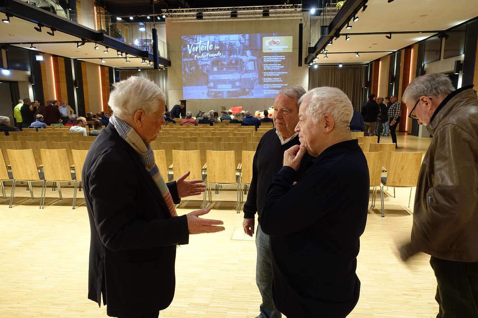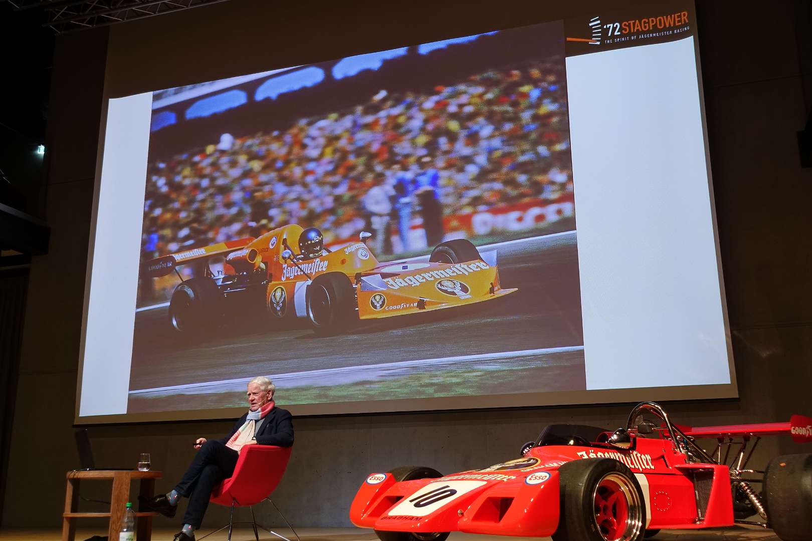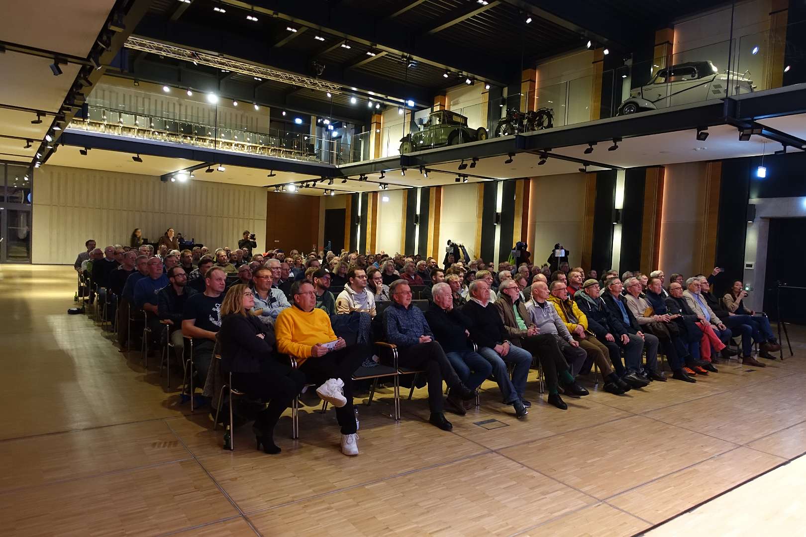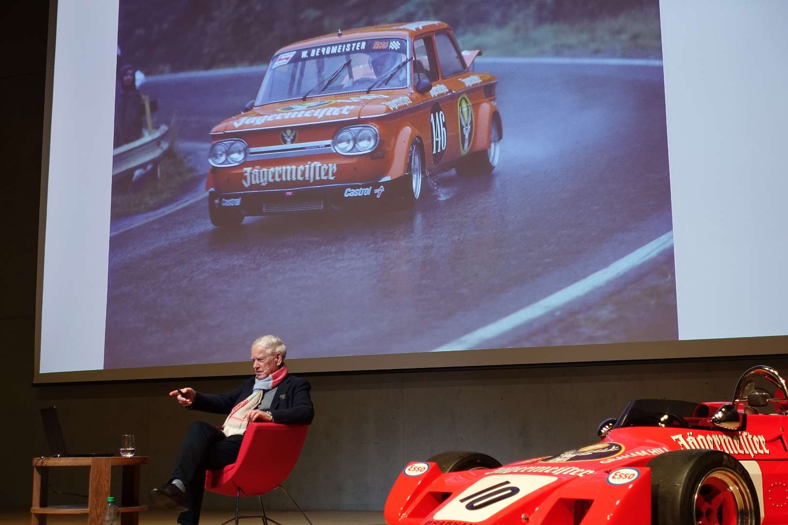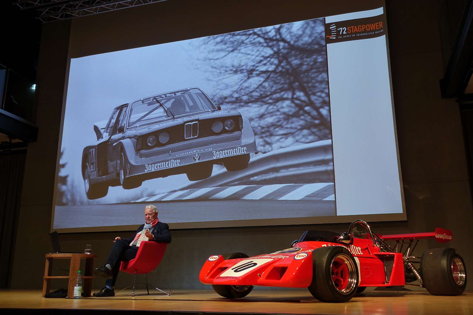 Eckhard Schimpf erzählte, so wie wir es von ihm kennen, vom damaligen Rennsport-Zirkus, wie es damals mit ihm und mit Jägermeister als Sponsoren anfing und was sich dank ihm, daraus entwickelt hat. Er managte fast drei Jahrzehnte lang das Jägermeister-Team, fuhr auch selbst viele Jahre hindurch Jägermeister-Rennwagen und errang rund 80 Siege, darunter beim 1000-Kilometer-Rennen auf dem Nürburgring 1976 und 1979. Er ist Journalist und schrieb etwa 20 Bücher, darunter sind Renntitel wie „Jägermeister Racing“, „Stuck“, „Porsche & Piëch“ und „Kurt Ahrens: Einer dieser verwegenen Kerle“. Die PS.Halle war bis zum letzten Platz sehr gut gefüllt und einige Freude vom Porsche Klassik-Stammtisch Braunschweig waren trotz widrigem Wetter nach Einbeck angereist. Eckhard Schimpf als wahrer Zeitzeuge hatte wieder packende Geschichten und tolle Bilder mit dabei. Natürlich konnte eine Auswahl seiner Bücher erworben werden und sie wurden auch von ihm signiert. Herzlichen Dank an das Team der FörderFreunde des PS Speicher für die Organisation. Mit einer sehr winterlichen und abenteuerlichen Rückfahrt ging es zurück nach BS. Nach rund 3 Stunden Fahrzeit und vielen Umleitungen erreichten wir am frühen Samstag-Morgen Braunschweig.